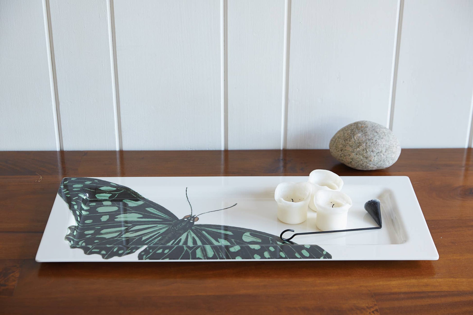Our Metamorphosis collection features a garden full of butterflies, ready to transform your table. Metamorphosis Extra Large Rectangular Tray is made from our heaviest weight melamine and dishwasher safe.