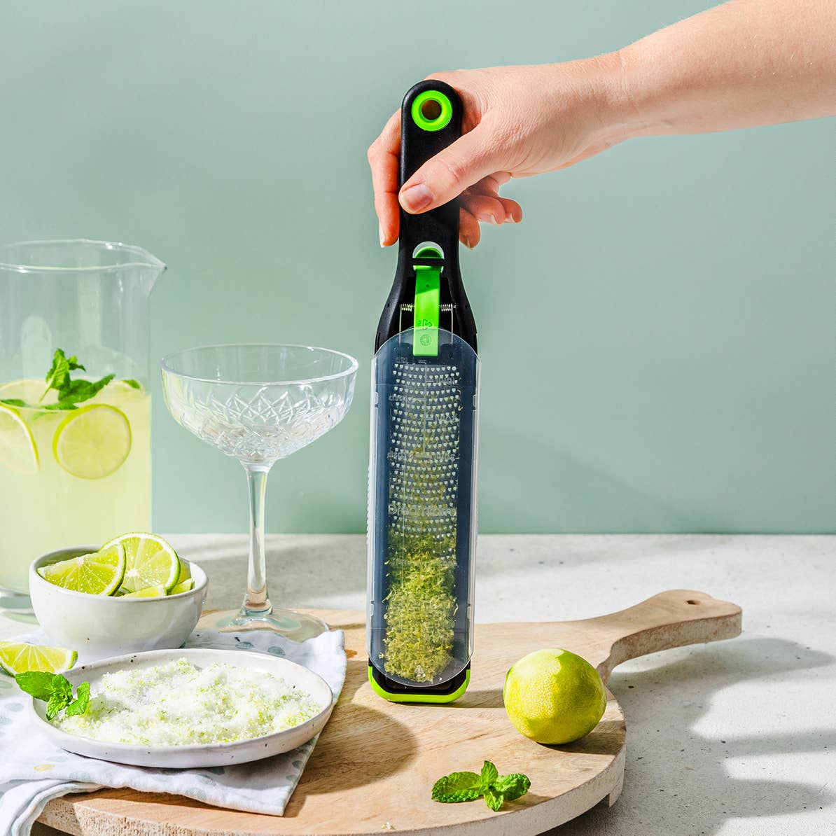 The Dreamfarm Ozest instantly cleans and clears itself of any clinging zest with the push of a button. Concave grater plate increases contact area for faster zesting and guides your food down its center for safer, more efficient strokes. 441 super fine blades are photo-etched and perfectly angled to create fluffier and more aromatic zest without the bitter pith.