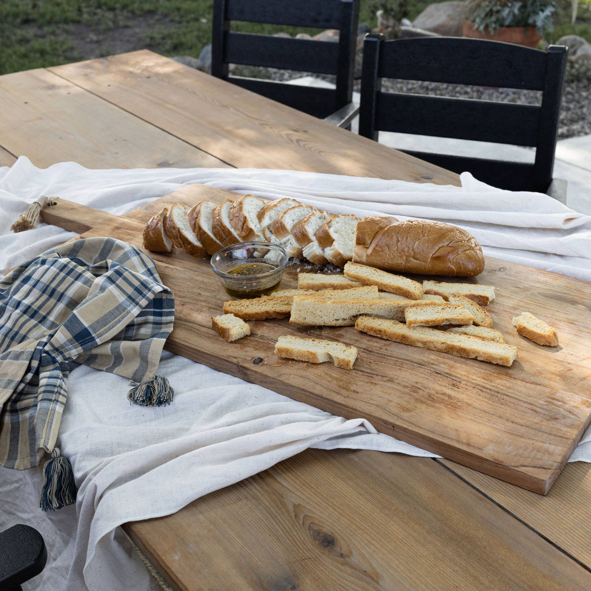 The classic style and shape of this serving board is inspired by vintage kitchen paddle boards, offering a functional piece with decorative elements. Beautifully crafted from sustainable acacia wood that is naturally strong and durable, adorned with a small jute tassel on the handle that infuses a rustic touch. The impressively extra-large size of this serving board is perfect for entertaining at large gatherings with a robust charcuterie board.